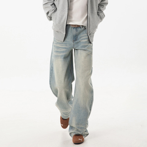Pantalones rectos Retro de moda para hombre de otoño, 3D bigotes de gato, pantalones vaqueros Vintage lavados desgastados, pantalones largos sueltos en tela vaquera