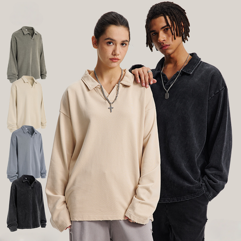 Colección Otoño Invierno de marca Unisex de moda 100% algodón de manga larga con cuello en Top V 380G Wash Distress Casual de punto